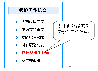注意:如果你是應屆畢業(yè)生可以進入"個人管理中心",位于左側子欄目的"我的工作機會",點擊"應屆畢業(yè)生職位"如下圖所示: